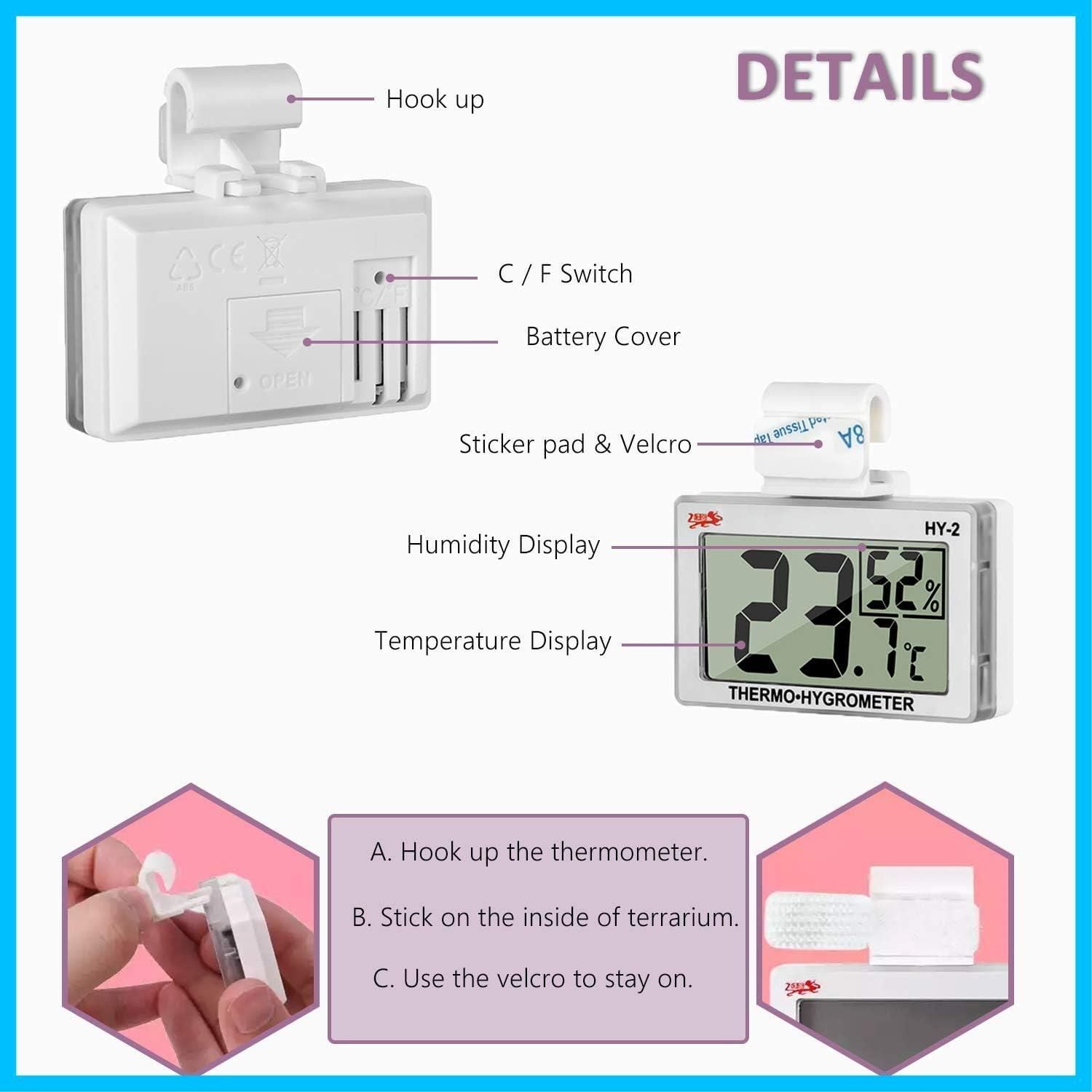 【幅広い用途】これはテラリウム、飼育箱や爬虫類タンクのどこにでも設置でき、あなたの視界を妨げません。この温度計を使用して、犬、猫、うさぎ、カメなど小動物の住居の温度と湿度を管理することもお勧めします。